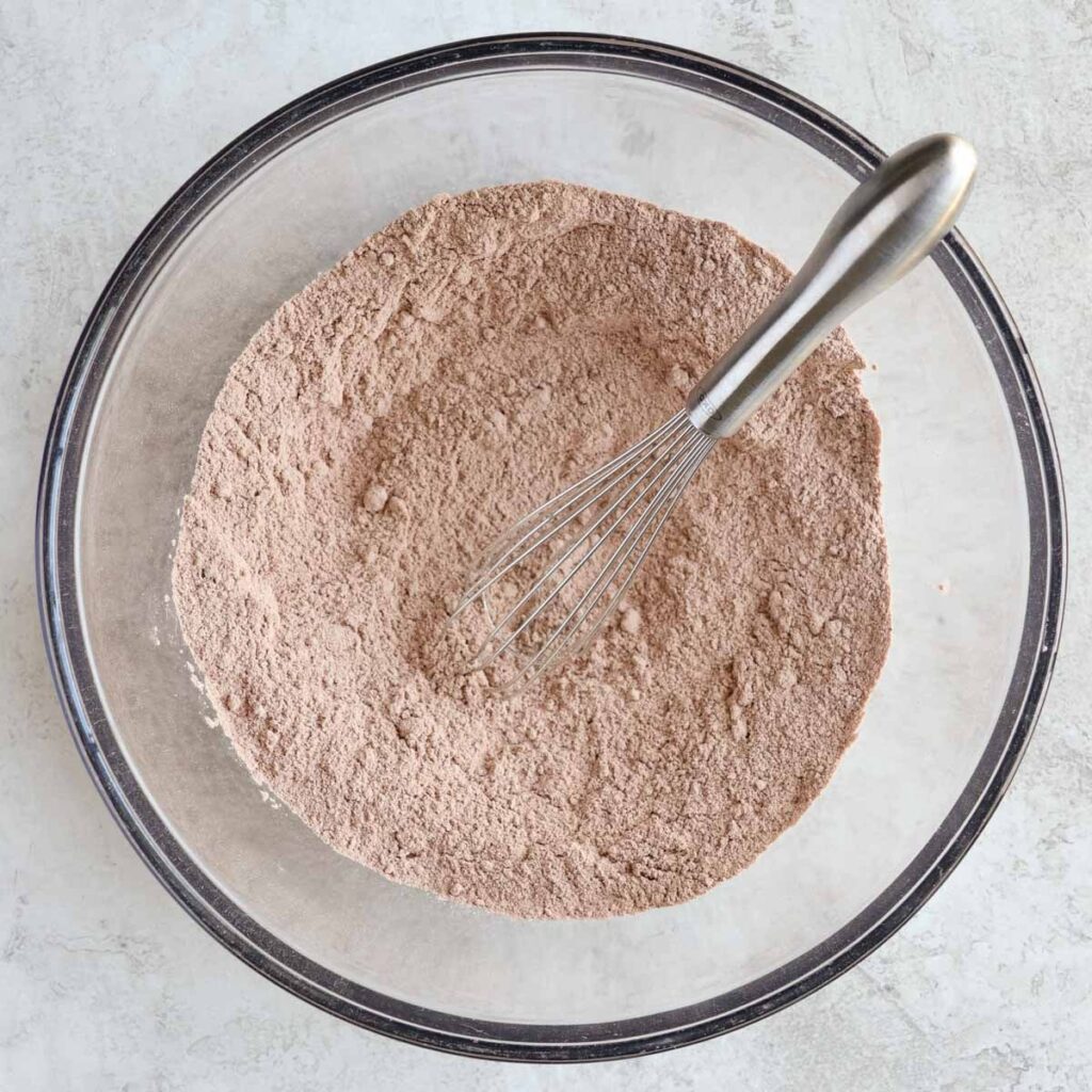 Step 2: In a large bowl, whisk together the flour, granulated sweetener, chocolate protein powder, cocoa powder, cornstarch, baking soda, and salt.