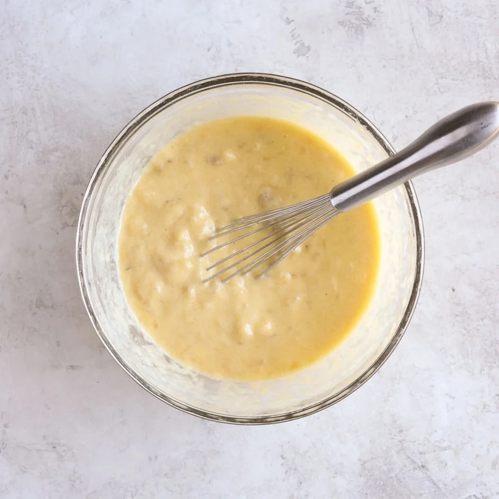 - Add the egg, olive oil, yogurt, and vanilla extract to the mashed bananas and whisk until fully combined.