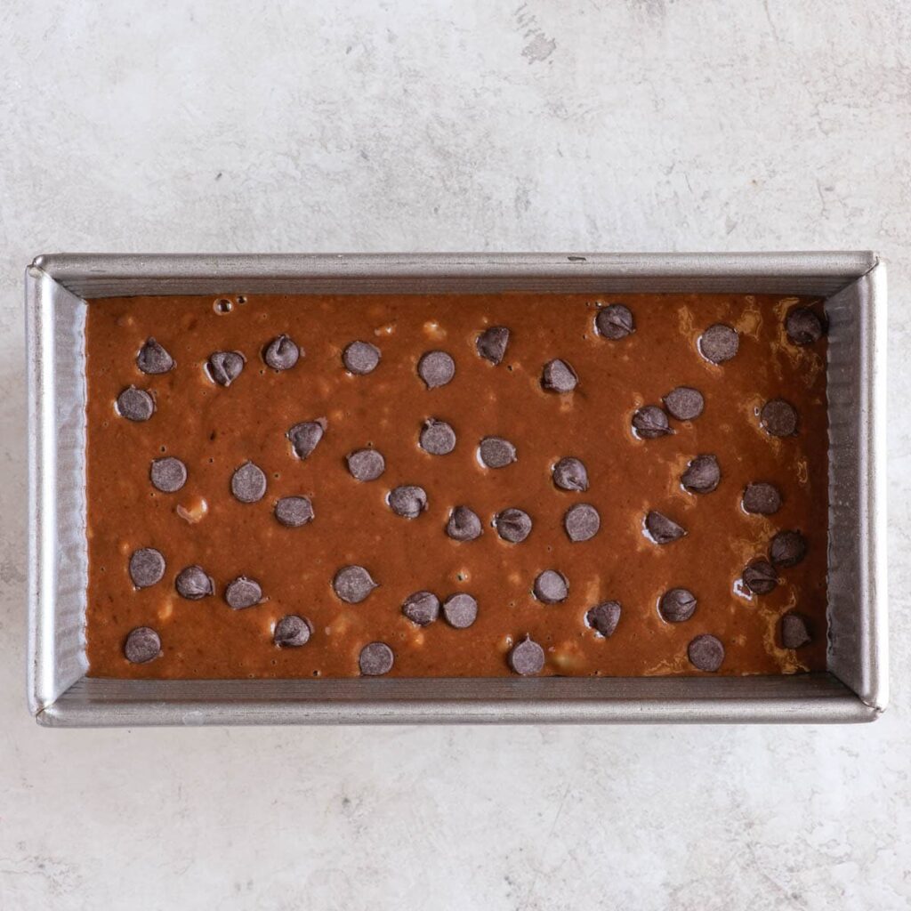 - Pour the batter into the prepared loaf pan and spread evenly. Sprinkle extra chocolate chips on top if desired.