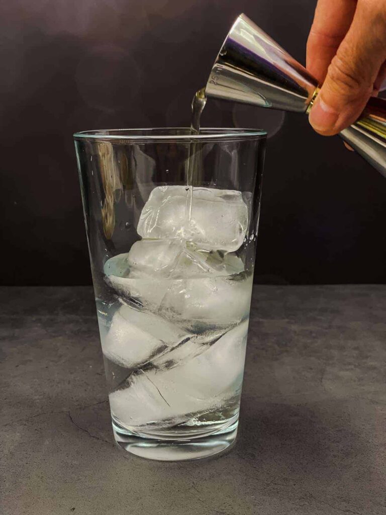 - Add the gin or vodka, dry vermouth, and olive brine to the shaker.