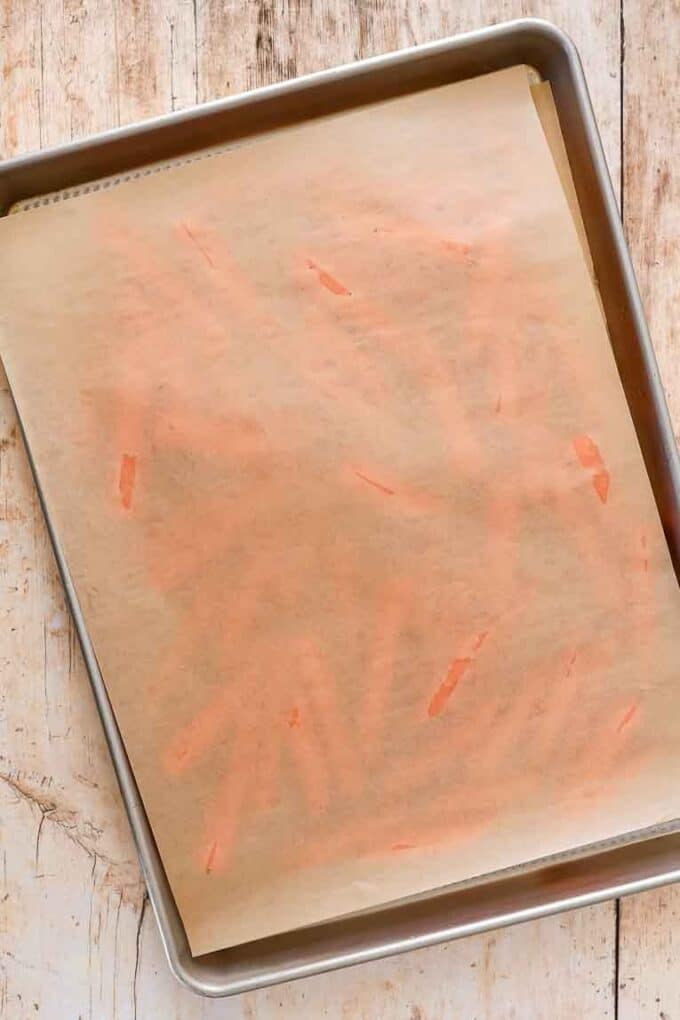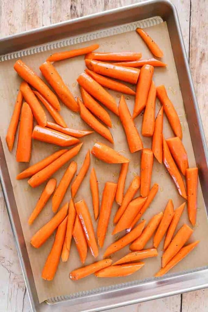 - Place the carrots on the baking sheet and toss them with 2 tablespoons of olive oil until evenly coated. Spread them out in a single layer without overlapping. Bake for 20 minutes.